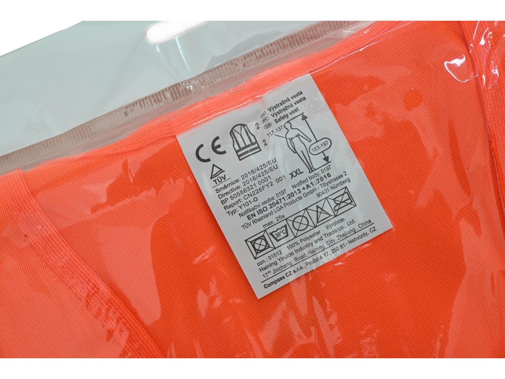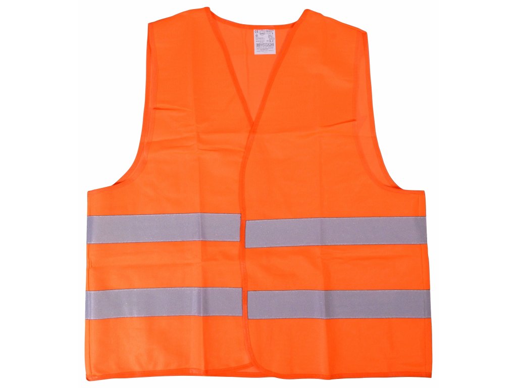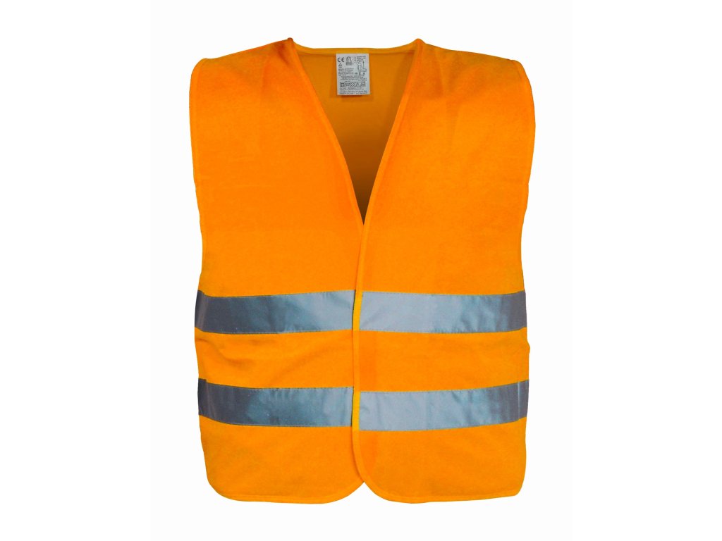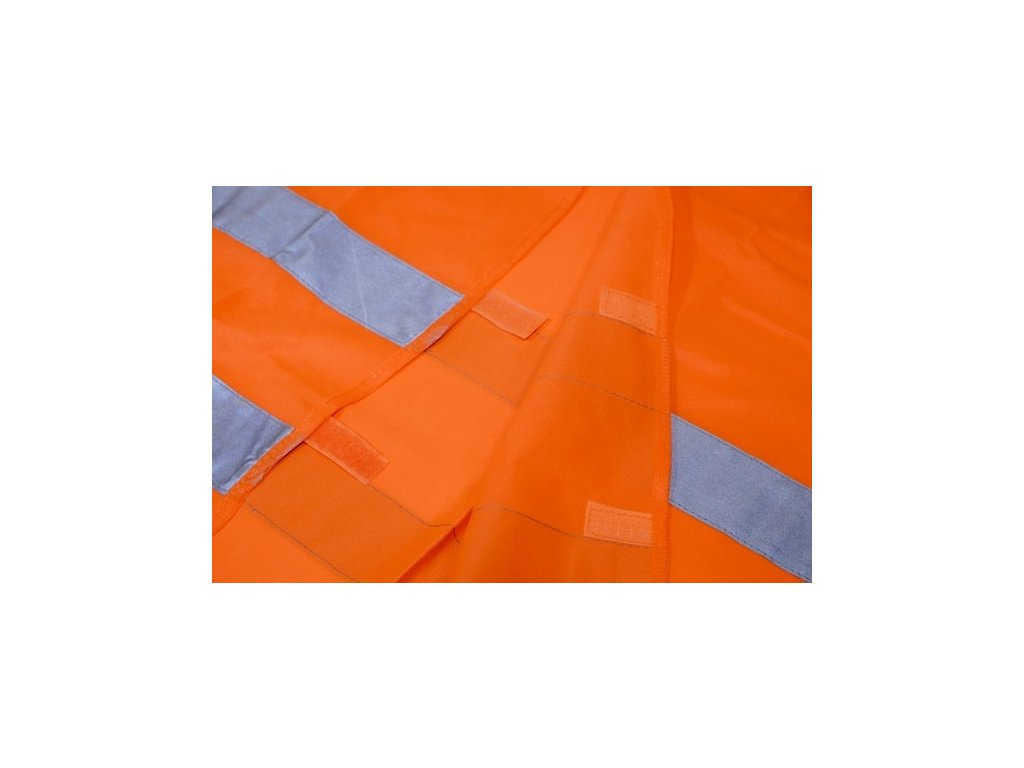 Výstražná reflexní vesta (ochranný oděv s vysokou viditelností) se zapínáním na suchý zip. Dva reflexní pruhy po celém obvodu, oranžová barva.