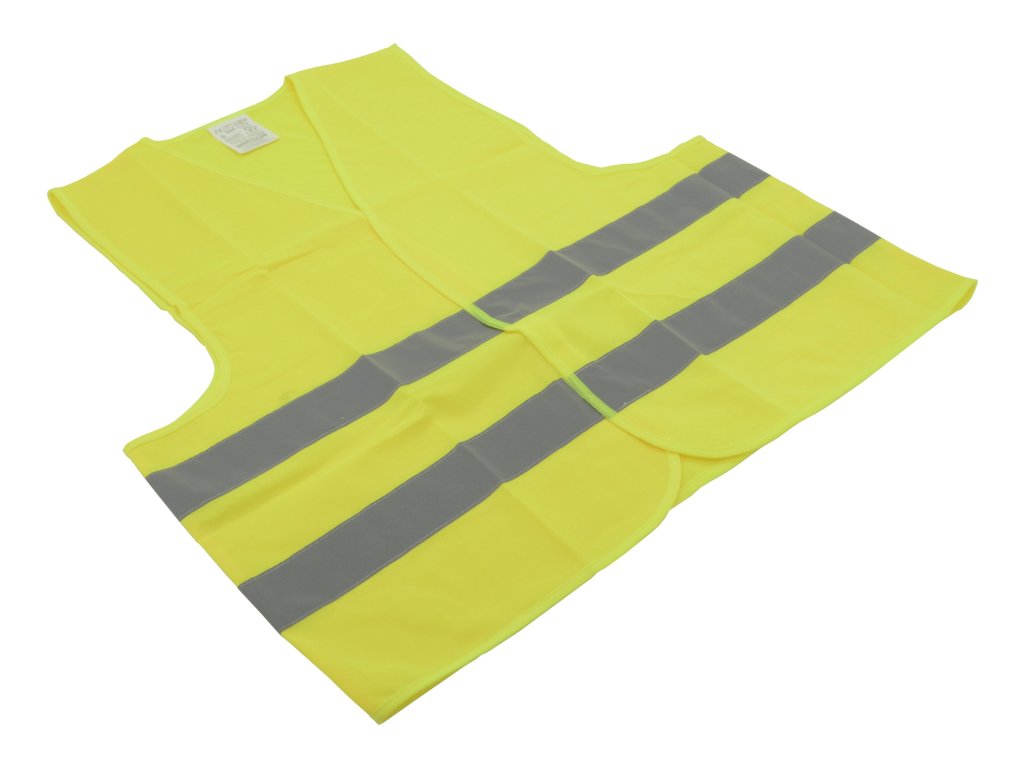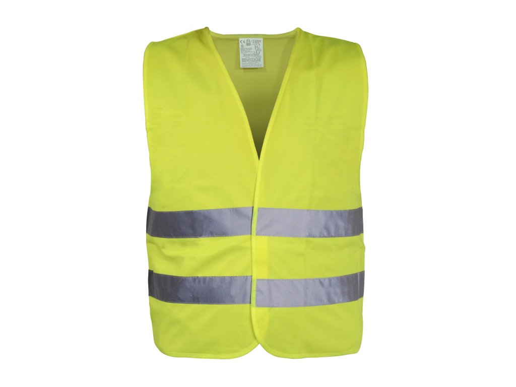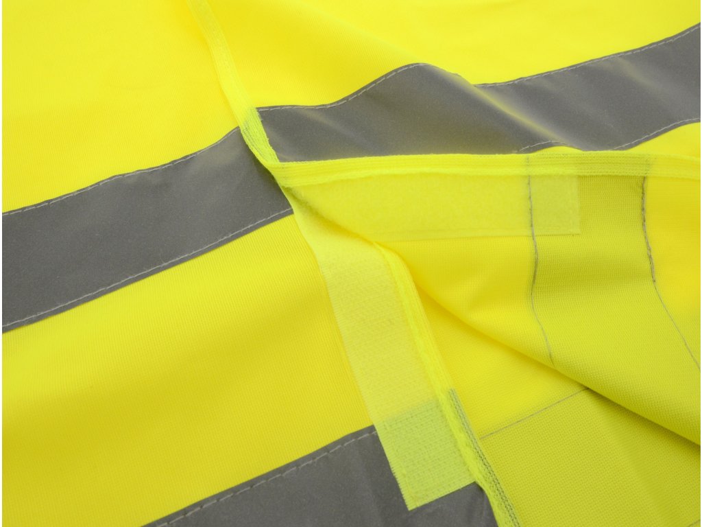 Výstražná reflexní vesta (ochranný oděv s vysokou viditelností) se zapínáním na suchý zip. Dva reflexní pruhy po celém obvodu, žlutá barva.