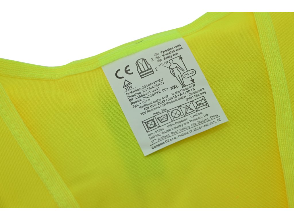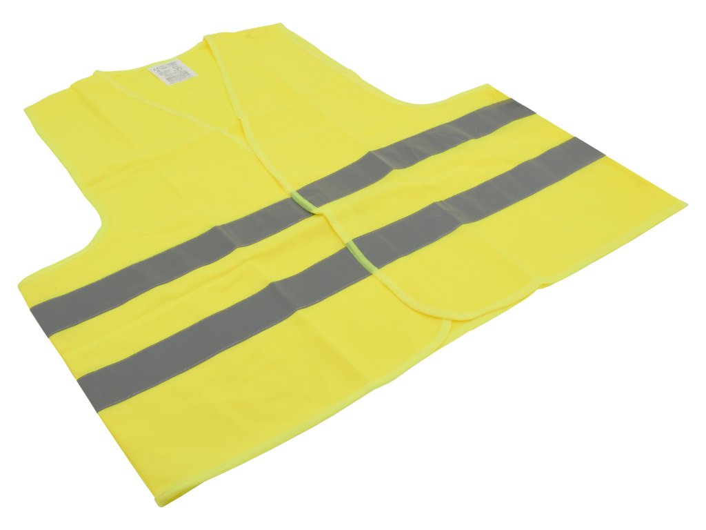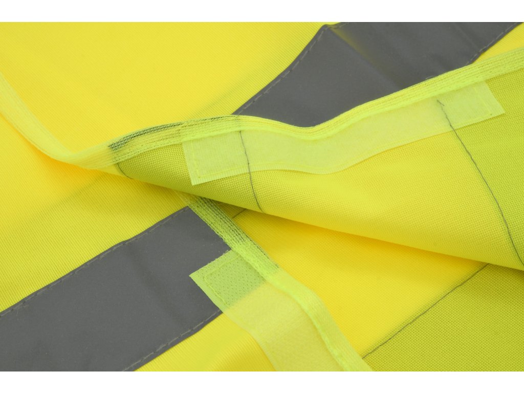 Výstražná reflexní vesta (ochranný oděv s vysokou viditelností) se zapínáním na suchý zip. Dva reflexní pruhy po celém obvodu, žlutá barva.