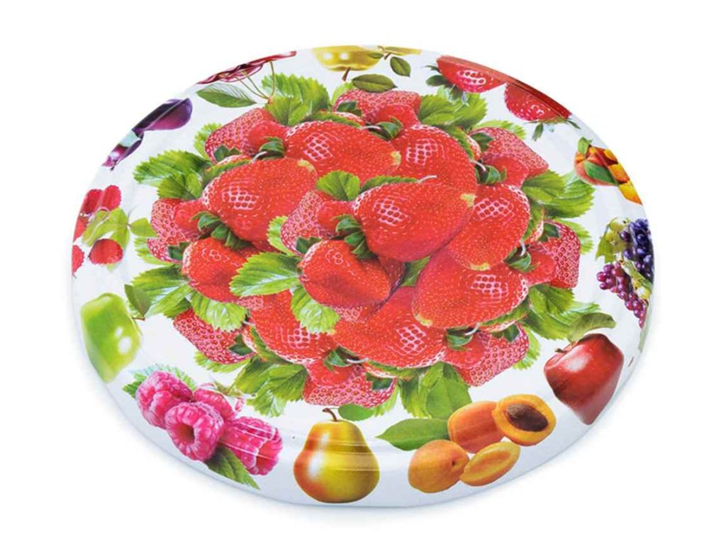 Materiál kov s dekorem ovoce.Zavařovací víčko na závitové sklenice (Twist) o průměru hrdla 82 mm, pro zavařování do 100°C.