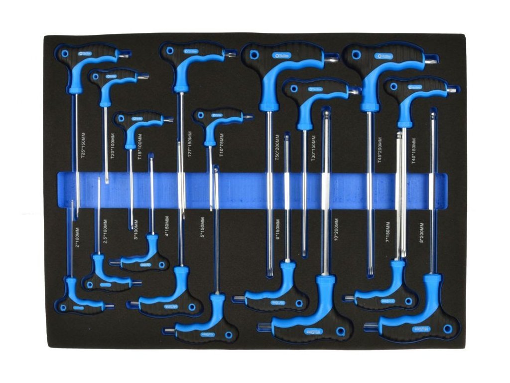 Vložka s nářadím do zásuvky dílenské pojízdné skříňky. Obsahuje 18 ks šroubováků Torx a Hex s "T" rukojetí.
