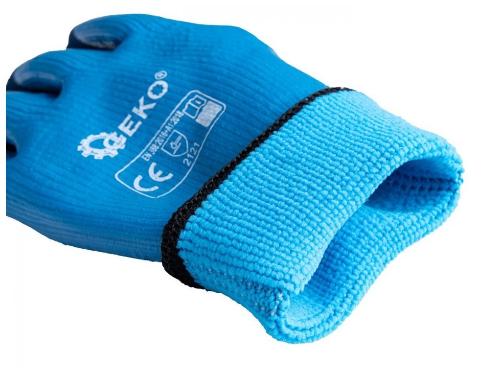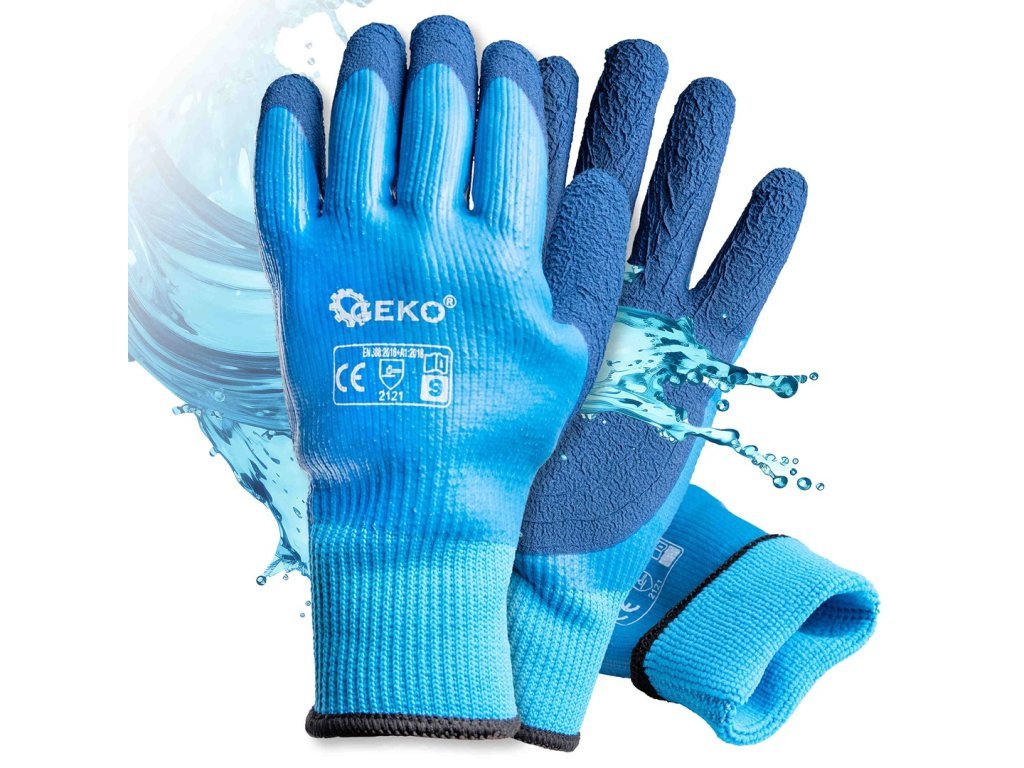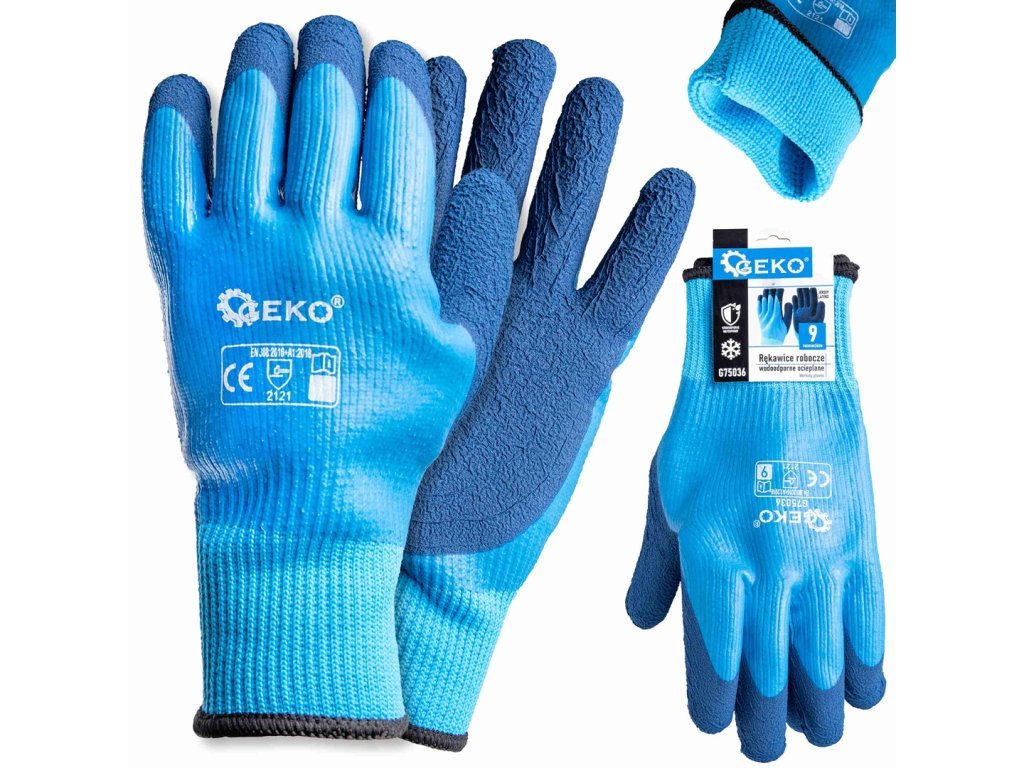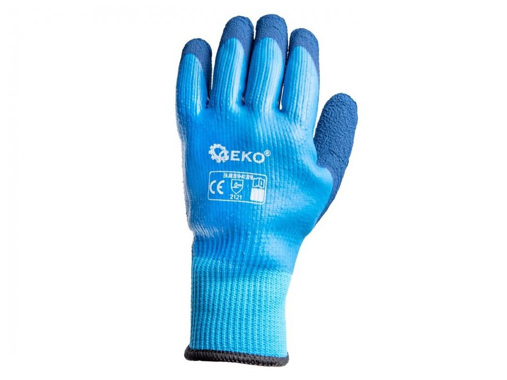 Voděodolné a zateplené pracovní rukavice G75036 značky GEKO velikost 9, vyrobené z materiálu jersey s ochrannou vrstvou latexu.