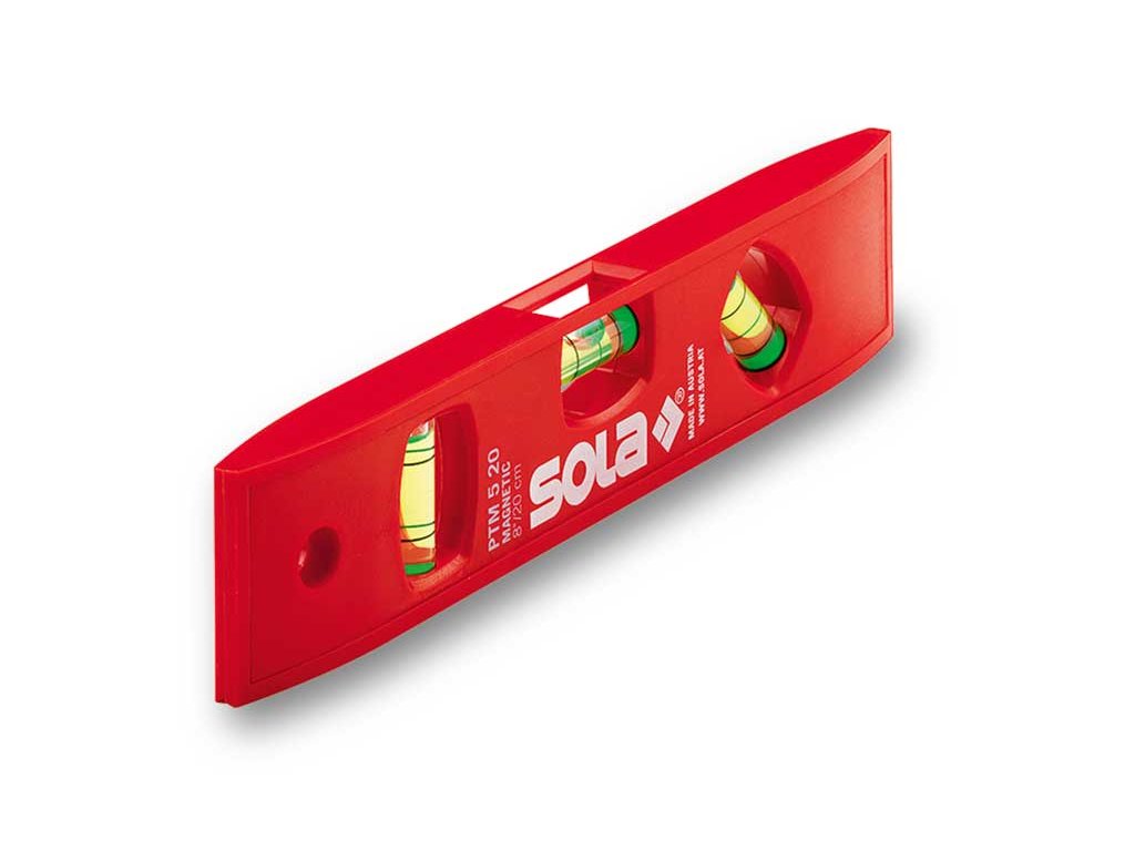 Plastová vodováha typu torpédo, délka 200 mm, s magnetickým proužkem a nerozbitnými libelami – SOLA PTM 5 20