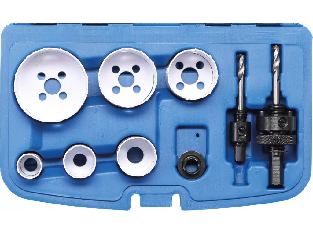 Sada 6 ks korunkových vrtáků a adaptérů pro vykružování otvorů.