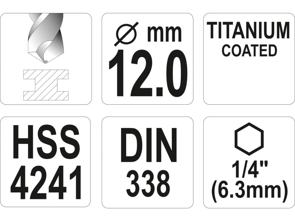 Vyrobeno z rychlořezné HSS oceli s Titanovým povlakem a vrcholovým úhlem 135°. Vrták je opatřen HEX 1/4" uchycením.