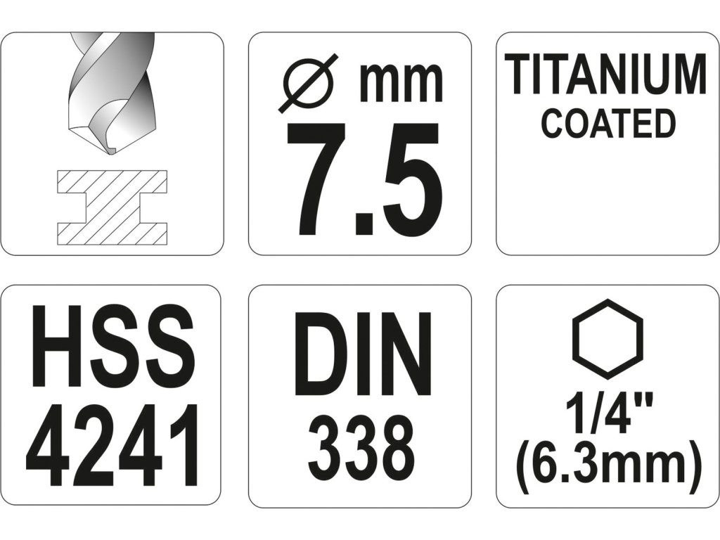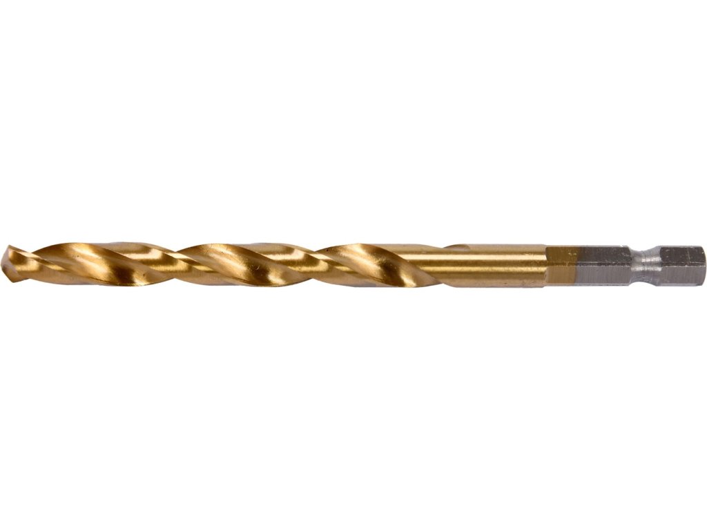 Vyrobeno z rychlořezné HSS oceli s Titanovým povlakem a vrcholovým úhlem 135°. Vrták je opatřen HEX 1/4" uchycením.