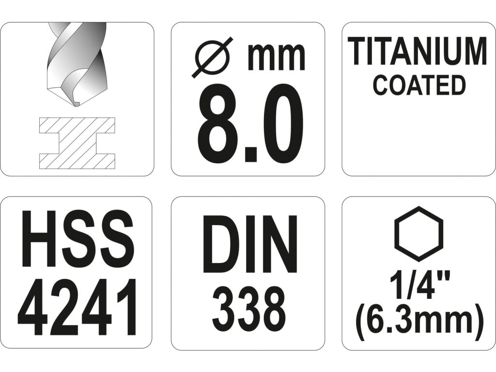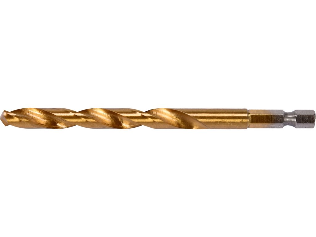 Vyrobeno z rychlořezné HSS oceli s Titanovým povlakem a vrcholovým úhlem 135°. Vrták je opatřen HEX 1/4" uchycením.