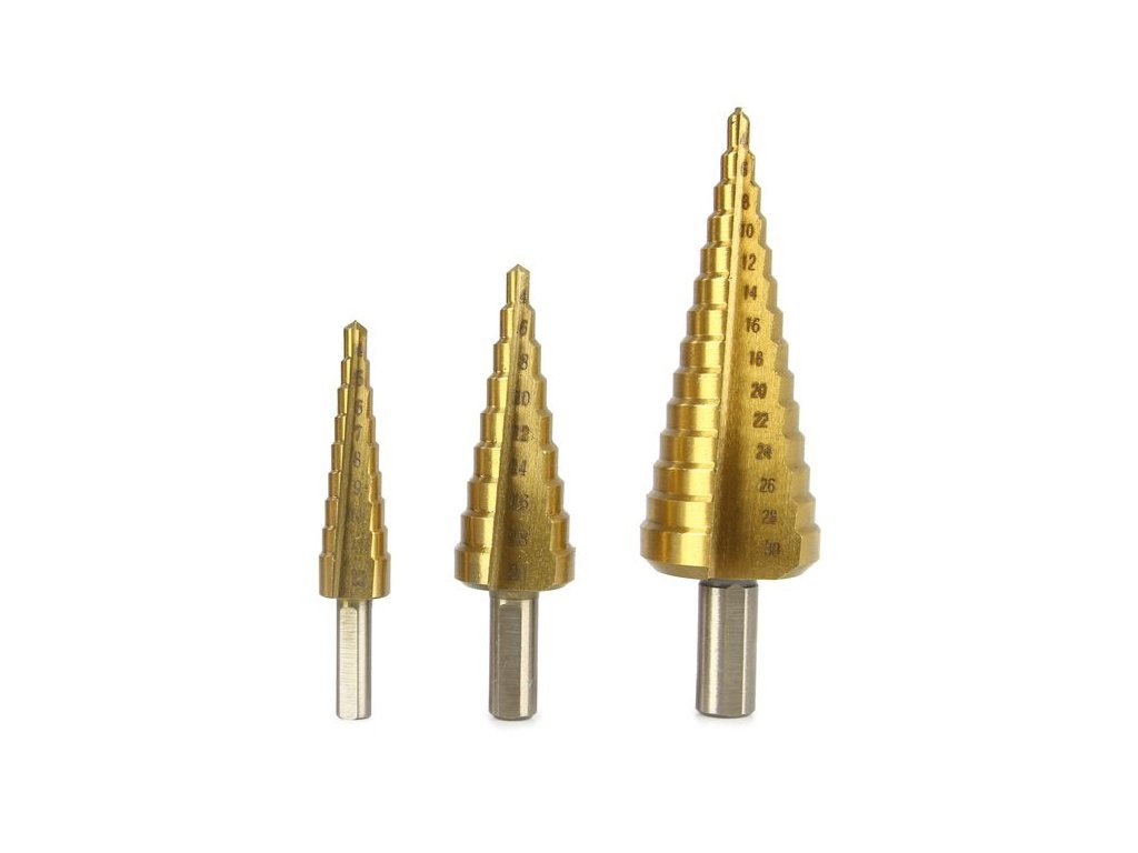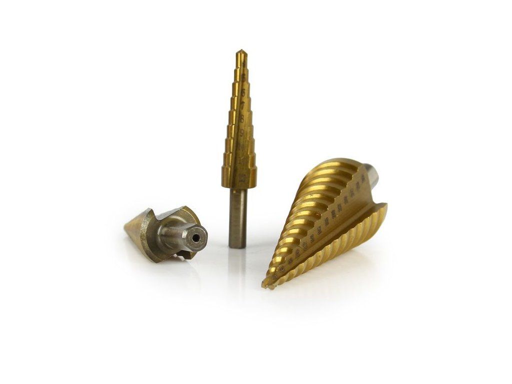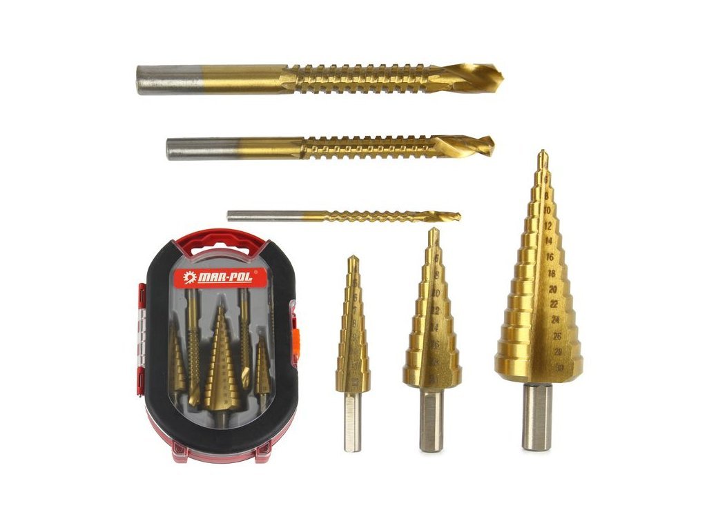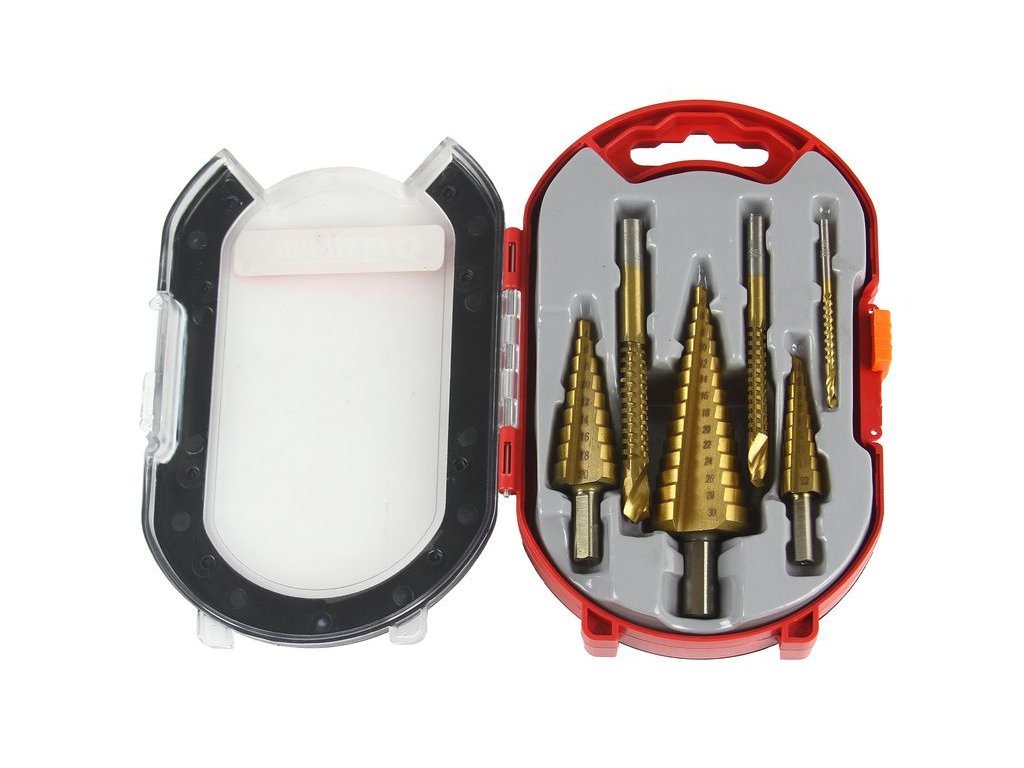 Praktická sada 3 ks stupňovitých vrtáků a 3 ks frézovacích vrtáků. Vhodné pro vrtání do měkkého kovu, plechů, plastu, dřeva atp.