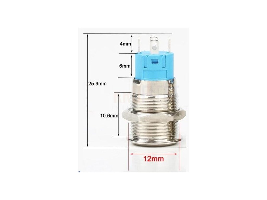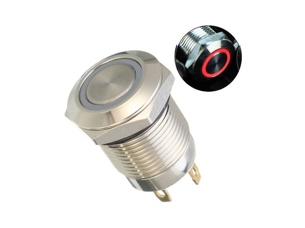 Vypínač stiskací OFF-ON 12mm, 250V/2A, červené prosvětlení 12V do otvoru 12mm, 1x kontakt 250V/2A, LED prosvětlení 12V po obvodu tlačítka se samostatným přívodem, antivandal, krytí IP44Doplňkové parametry