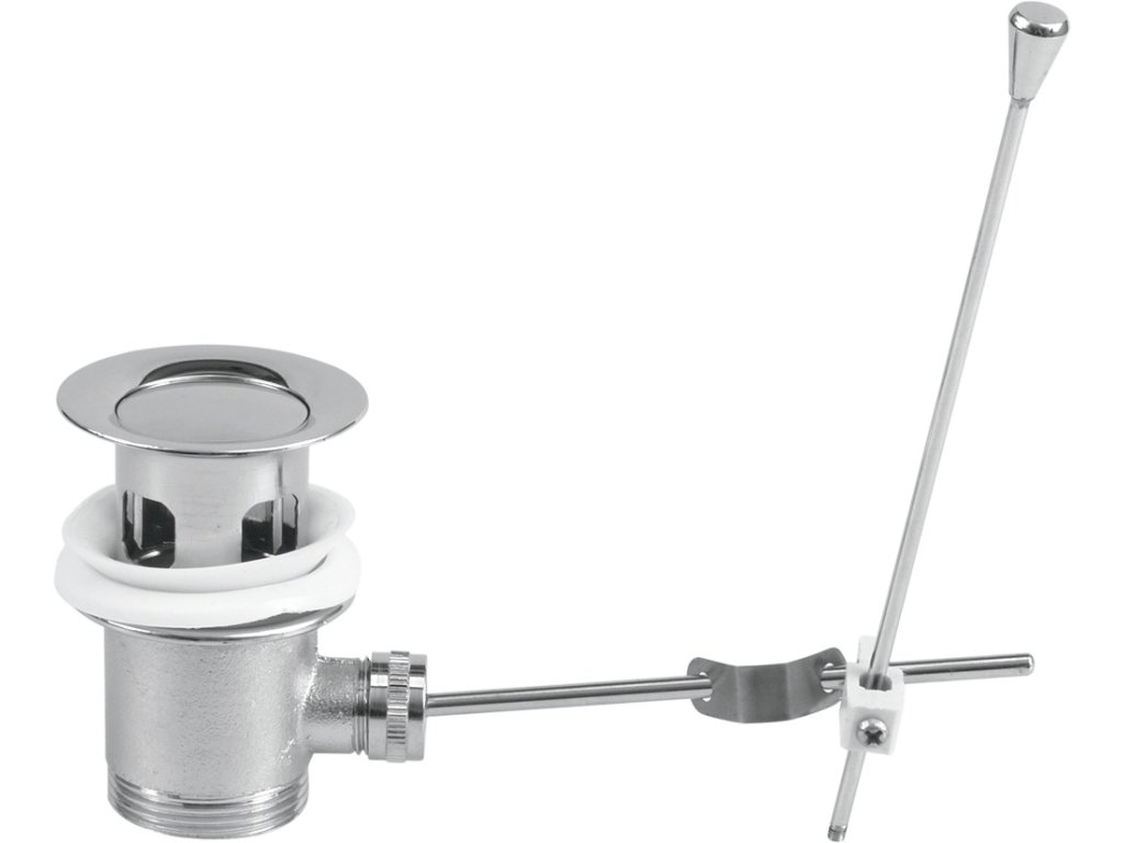Umyvadlová výpusť, kde se zátka otevře či uzavře pomocí táhlového mechanizmu.