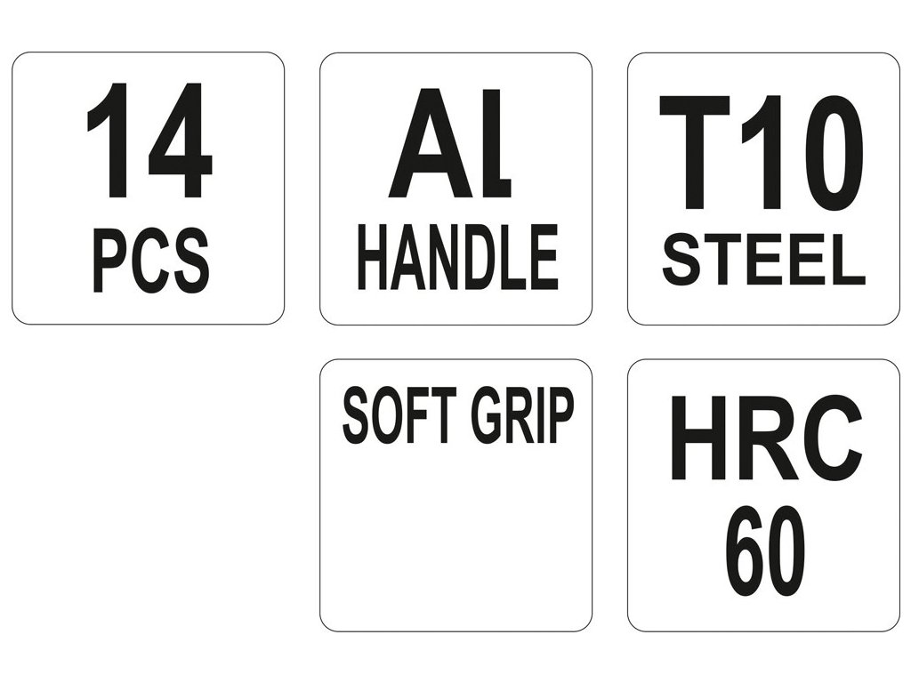 Rukojeť je vyrobena z hliníku s otočným hrotem. Sada je uložena v krabičce odolné proti nárazům.