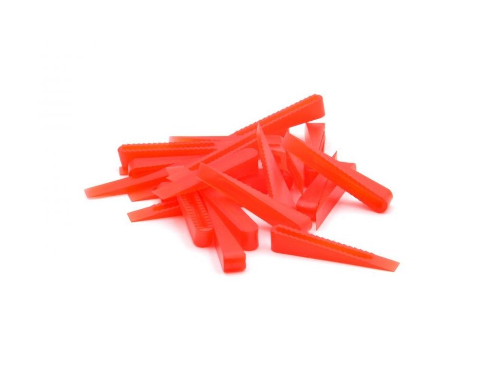 Po nanesení lepidla zasuňte svorky pod dlaždice tak, aby na každé straně dlaždice byly 2 svorky Posuňte následující příchytku. Vložte klín do otvoru svorky a zatlačte dolů, aby se dlaždice zarovnaly. Po nanesení malty (lepidla) na glazuru odstraňte svorku lehkým nárazem. Umístěte kleště s přední částí na klín a zadní čelist na konci klínu, správně nastavte vzdálenost čelistí a zatlačte rukojeť, aby se klín zasunul do svorky, což způsobí, že desky se zvednou.