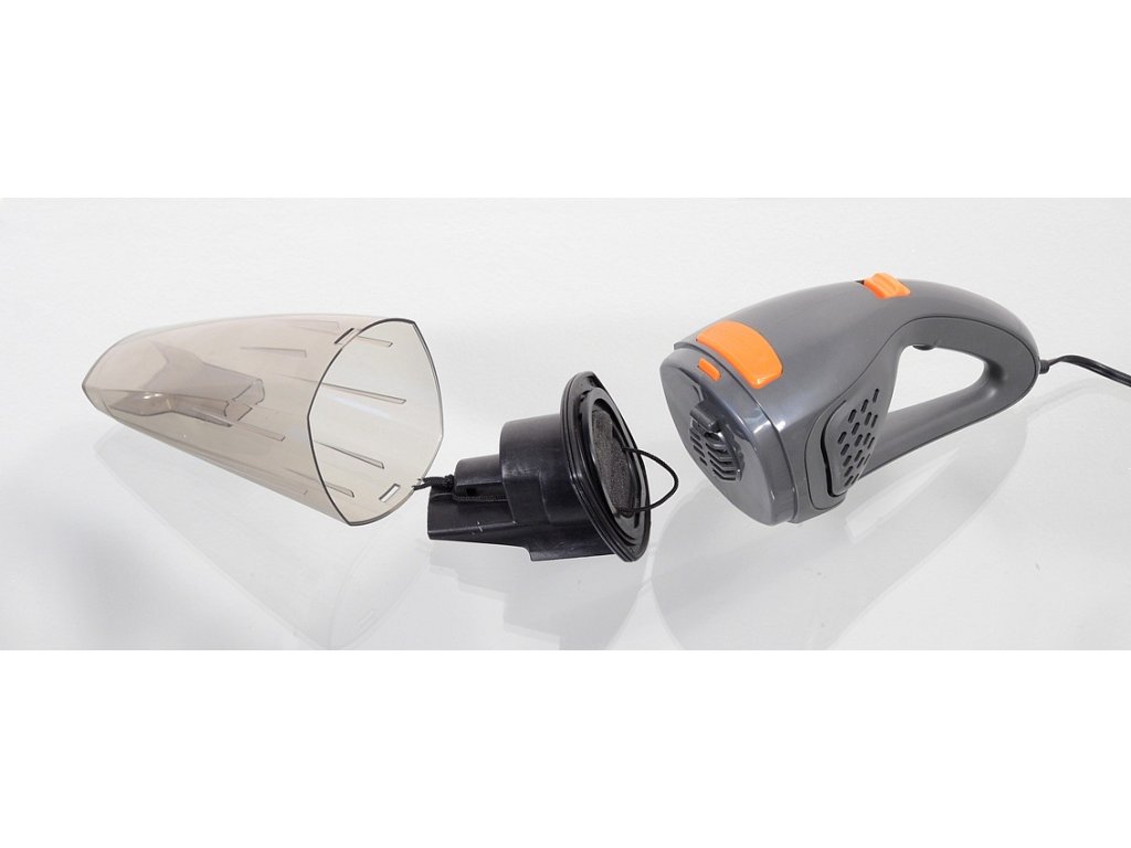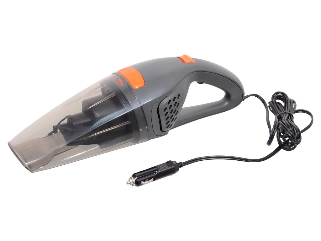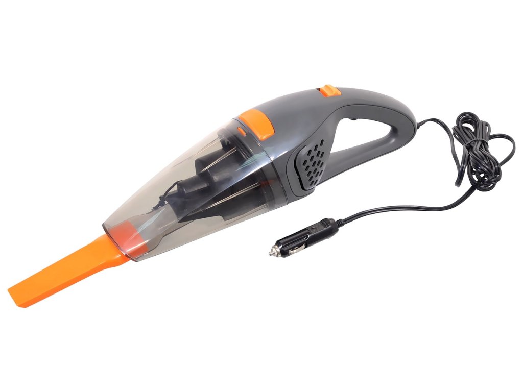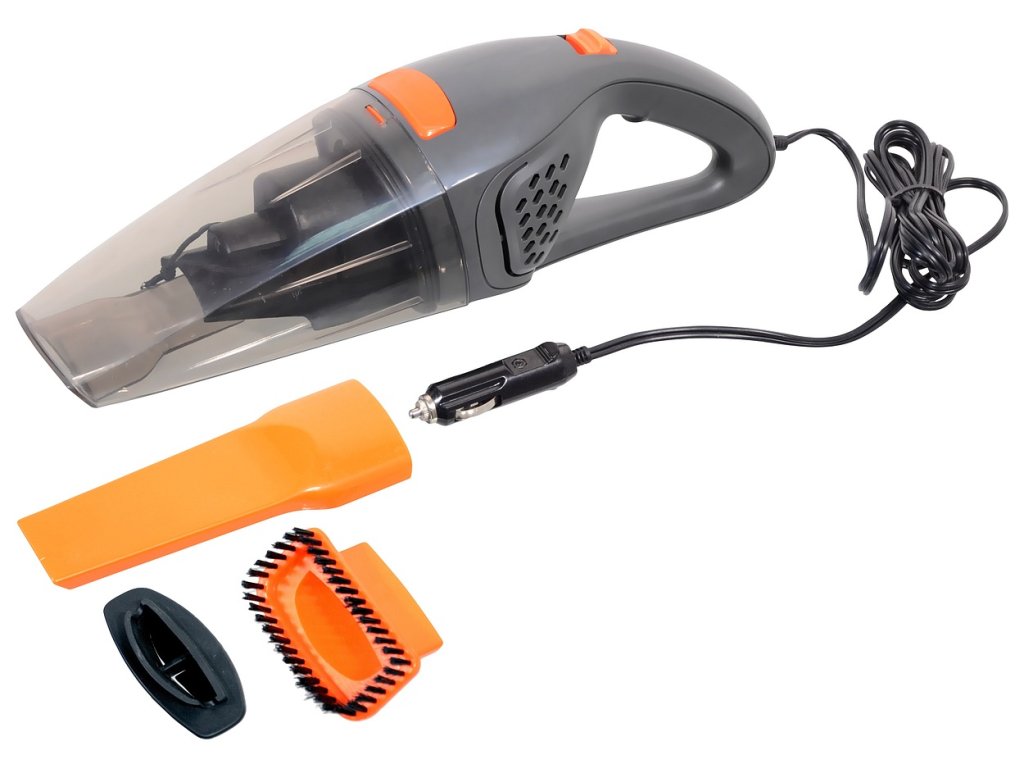 Přenosný vysavač s dlouhým kabelem a se zástrčkou do zásuvky automobilového zapalovače 12V.