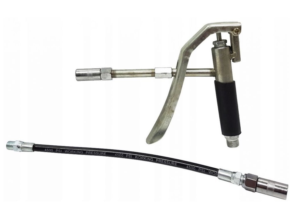 Součástí je 4metrová tlaková hadice, která umožňuje pohodlný dosah i do hůře přístupných míst. Maznice je vybavena stabilní konstrukcí, snadno se ovládá a díky kompaktním rozměrům (350 × 170 × 500 mm) se dobře skladuje i přenáší.