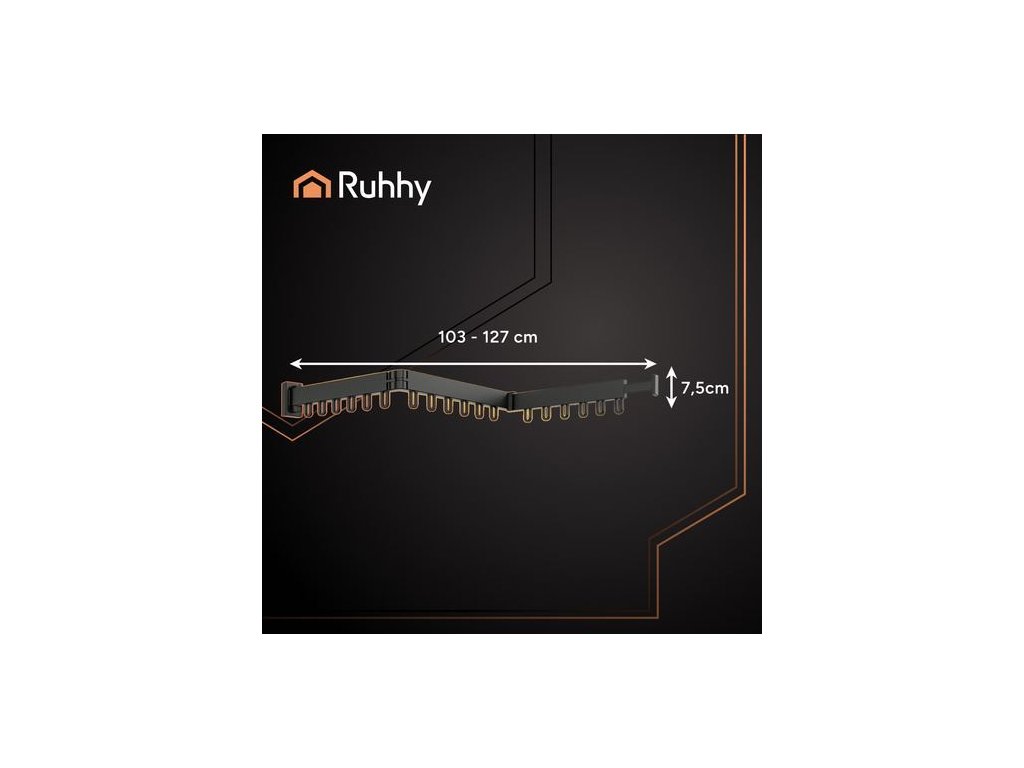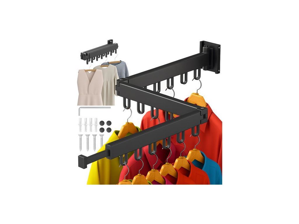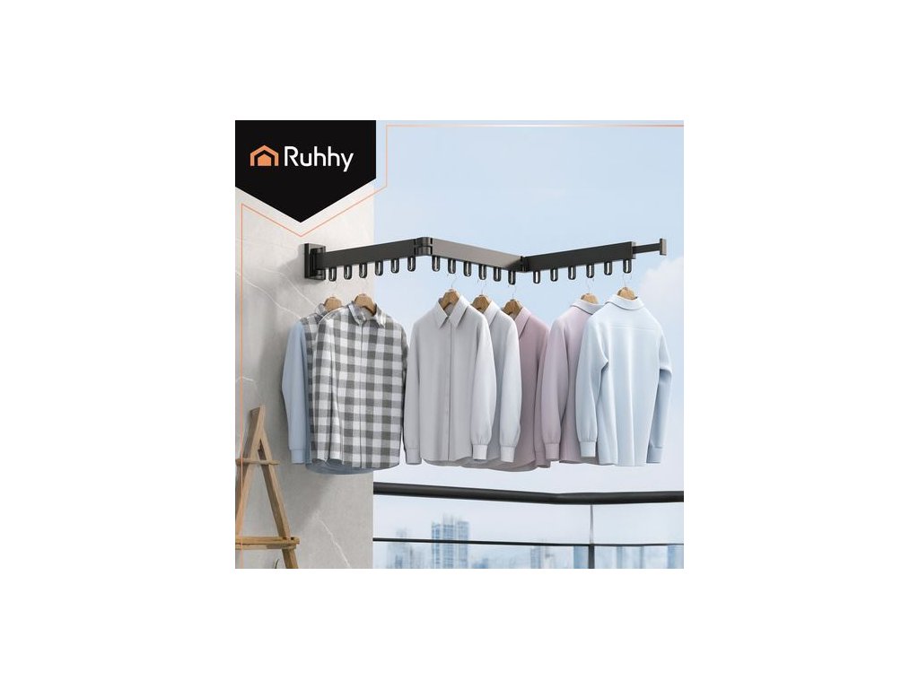 Výsuvný nástěnný věšák, trojitý, 18 háčků, černý, Ruhhy Praktický a prostorově úsporný věšák na oblečení je ideálním řešením pro sušení nebo odkládání oblečení ve vašem bytě, na balkóně, v prádelně či šatně. Díky skládací konstrukci ve tvaru harmoniky a pevnému uchycení na zeď můžete věšák vysunout pouze tehdy, když jej opravdu potřebujete – a jinak jej složit, aby nezabíral místo.Trojité rameno nabízí až 18 háčků pro zavěšení ramínek s oblečením,ručníků či jiných textilií. Odolná konstrukce z kovu a plastu zajistí dlouhou životnost i při častém používání.