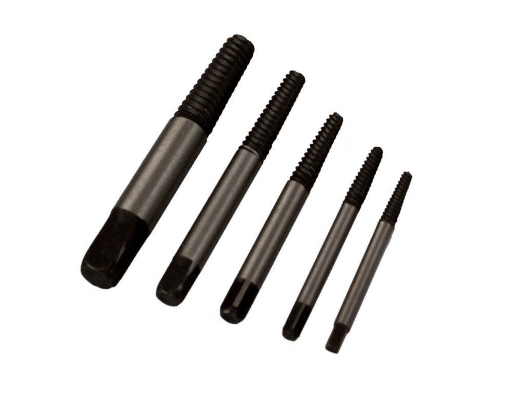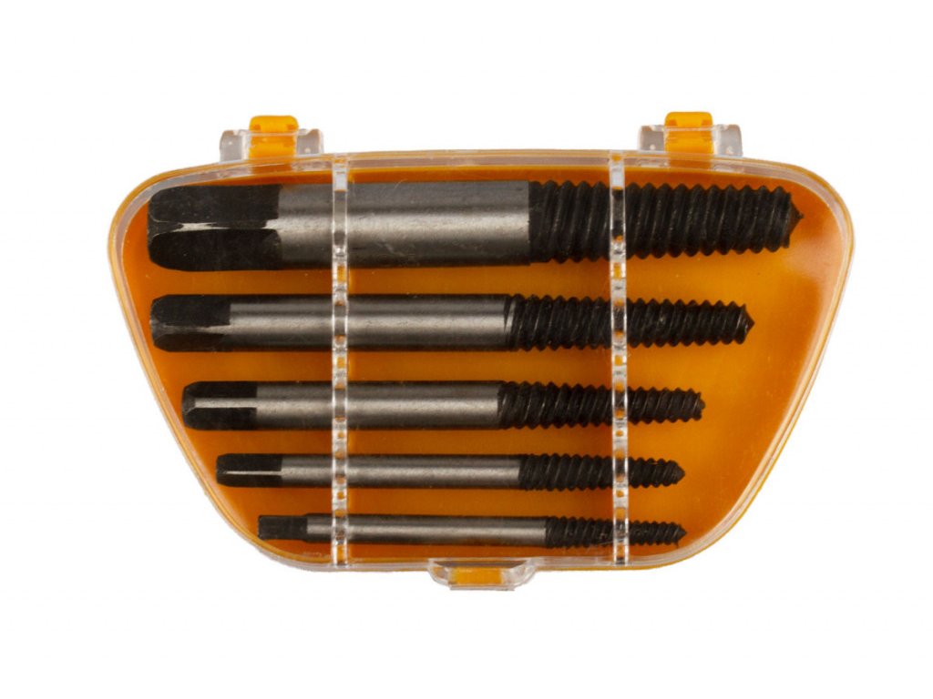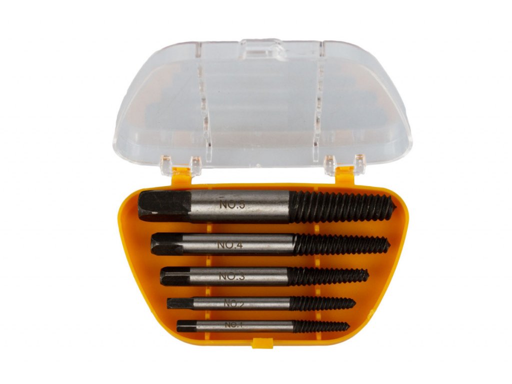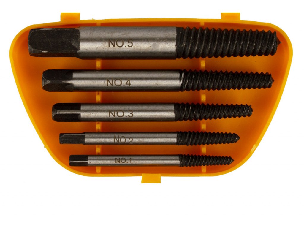 Vytahováky zalomených šroubů v sadě 5 kusů přehledně uložených v plastovém boxu. Sadu využijete k vyproštění ulomených šroubů a čepů s velikostí závitu M3 - M18.