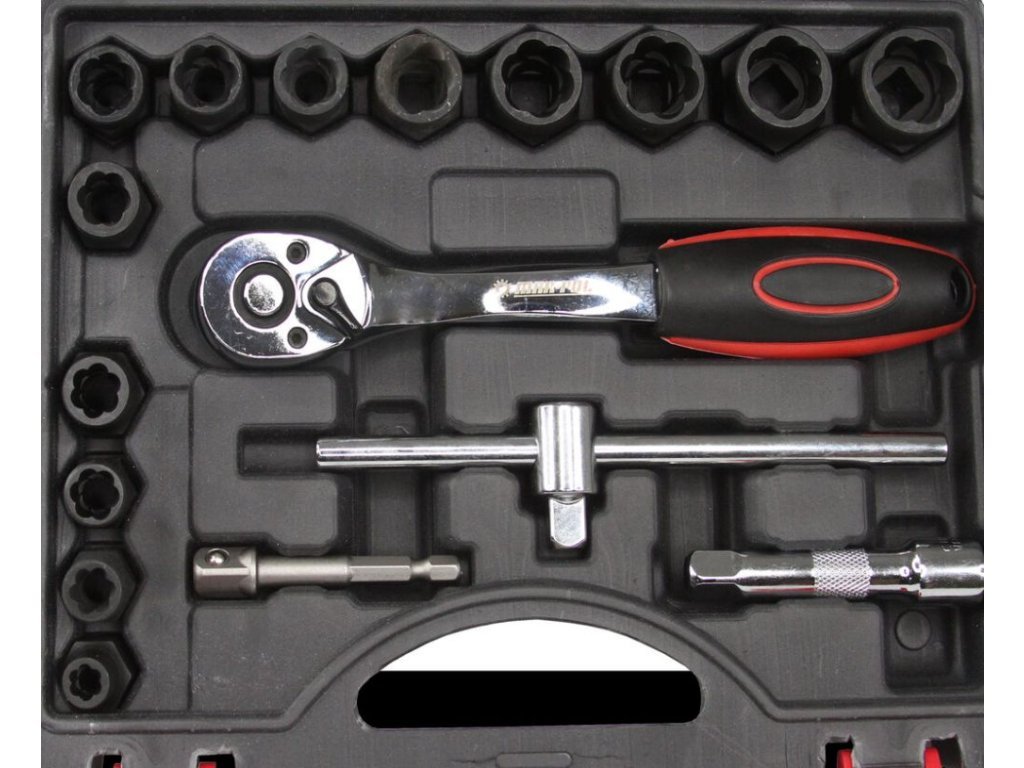 Sada obsahuje vytahováky pro šrouby od M3 do M14, vrtáky pro předvrtání, nastavitelné vratidlo, ráčnu 3/8" a 13 ks nástrčných hlavic pro stržené nebo jinak poškozené hlavy šroubů a další užitečné nástroje.