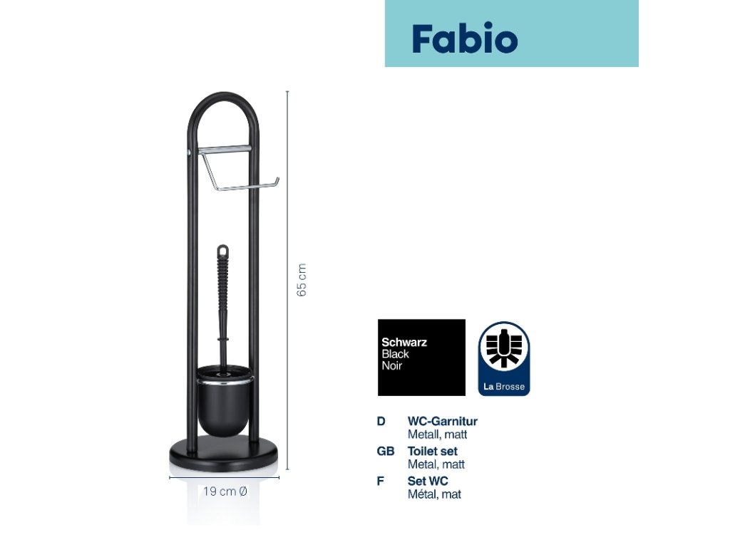 Toaletní set Fabio je praktický a stylový doplněk pro vaši koupelnu. S tímto setem budete mít všechny potřebné věci vždy po ruce. Kelímek držáku toaletní štětky je vyroben z plastu a jednoduše se zavěsí do kovového kroužku. Tento set nabízí snadnou údržbu, protože kelímek lze snadno vyprázdnit a vyčistit.