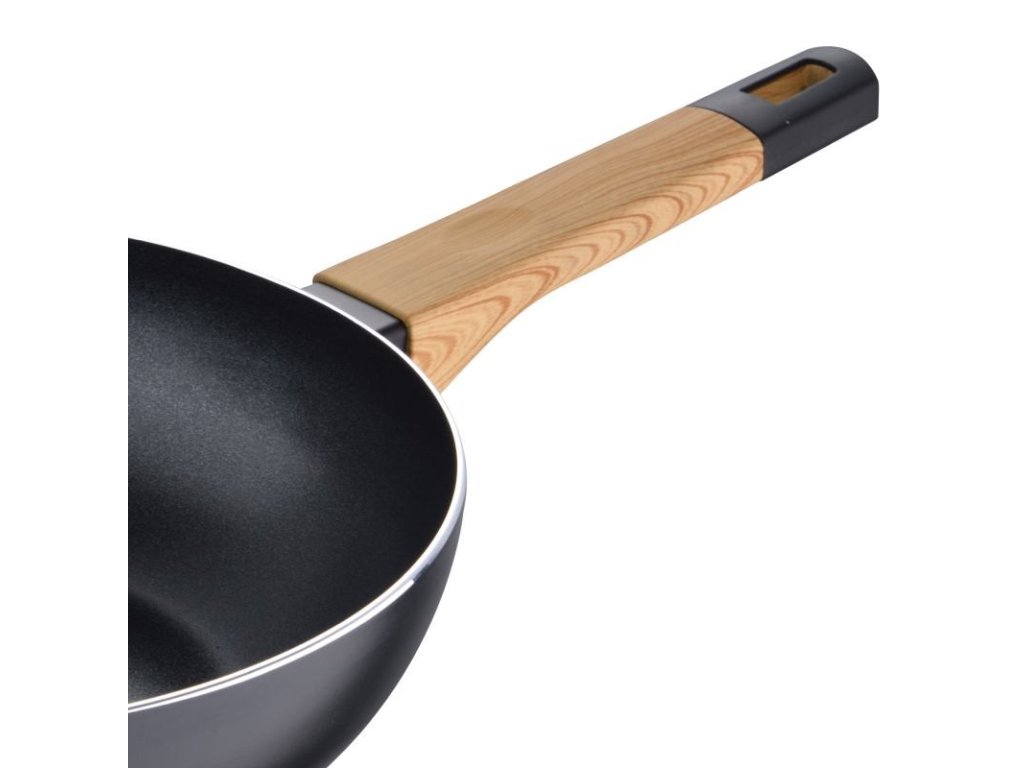 • Wok o průměru 28 cm • Lisovaná hliníková pánev, která se přizpůsobí úrovni uživatele. • Odolná nepřilnavá pánev, která nabízí optimální výkon. • Ergonomická tepelně odolná rukojeť. Technologie Soft Touch pomáhá kontrolovat teplo a zabraňuje popálení rukou. Silikonová rukojeť zajišťuje dobrý úchop a lepší ovládání pánve.•Vhodné do všech kuchyní. Tuto elegantní pánev lze použít s dalším nádobím ze stejné řady a přizpůsobí se každému stylu kuchyně.Wok 28 cm z kolekce Bergner's Earth Black je vyroben z lisovaného hliníku, který rychle rozvádí teplo, a prémiový nepřilnavý povlak ILAG je velmi odolný díky dobré odolnosti proti poškrábání a oděru, vhodný pro každodenní použití. Vzhledem ke složení materiálu je při vaření v tomto woku bez PFOA, olova a kadmia, ideální pro zdravé vaření, nutné použít pouze malé množství tuku. Ergonomická měkká na dotek, tepelně odolná dřevěná rukojeť, která zabraňuje požáru. Základna s indukčním bodem je vhodná pro všechny sporáky jako je indukční, plynový, sklokeramický, halogenový a elektrický. Ideální pro míchání přísad pro vaření v páře, restování, vaření a rovnoměrné potahování a smažení, aniž by se potraviny přilepily na povrch, což umožňuje snadné čištění. Pro prodloužení životnosti produktu se doporučuje ruční čištění.