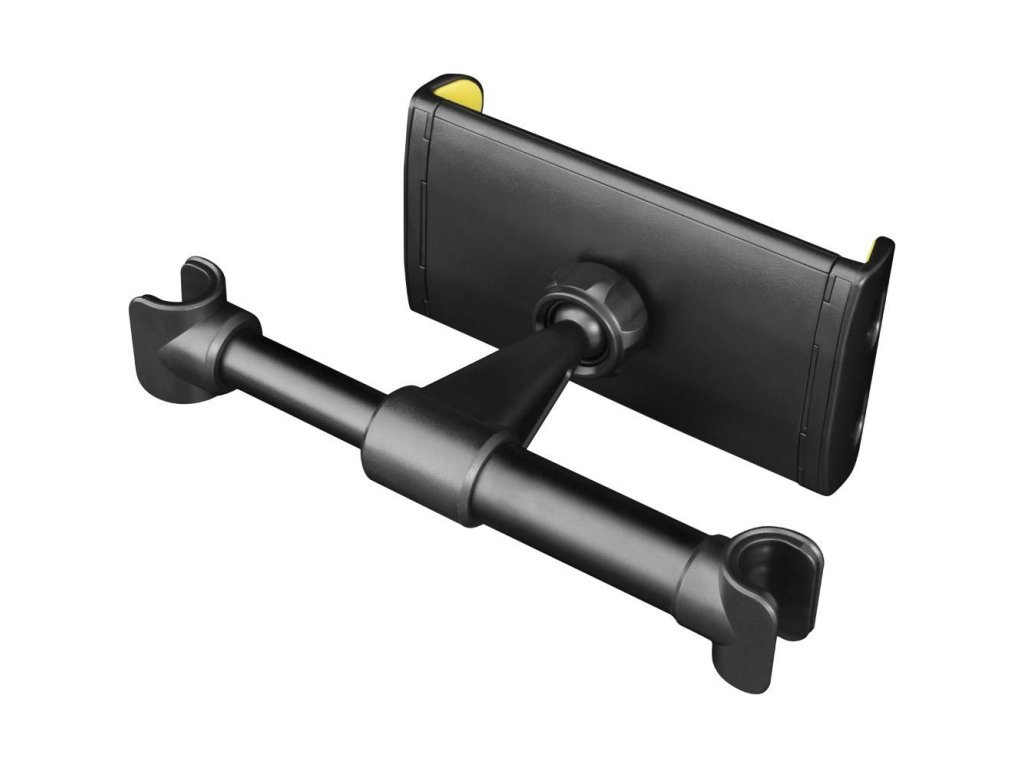 Univerzální a pevný držák pro tablety do auta s montáží do prostoru opěrky hlavy s otočným kloubem pro nastavení ideálního úhlu. Držák je vhodný pro tablety velikost 7"–10". Díky montáži držáku do prostoru opěrky hlavy mají spolujezdci na zadních sedačkách možnost sledovat filmy nebo hrát hry během dlouhé cesty na dovolenou. Pogumované čelisti držáku tablet zafixují a ochrání ho proti pádu při nerovnosti na silnici. Otočný kloub s možností otočení o 360°. Tablet lze nastavit na výšku nebo šířku, případně ho polohovat do potřebného úhlu.
