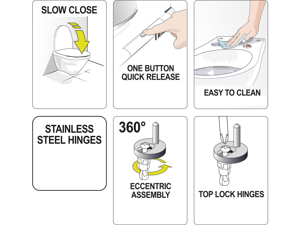 WC prkénko SLIM se zpomalovacím sklápěcím mechanizmem, zajišťuje tiché a volné dosednutí prkénka k míse.