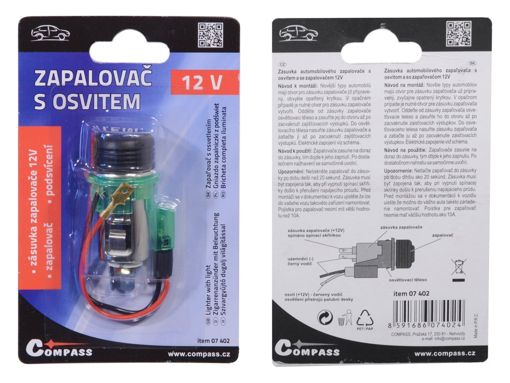 Kovová zásuvka automobilového zapalovače s osvětlením + zapalovač. Určeno pro montáž do automobilů s napětím 12V.
