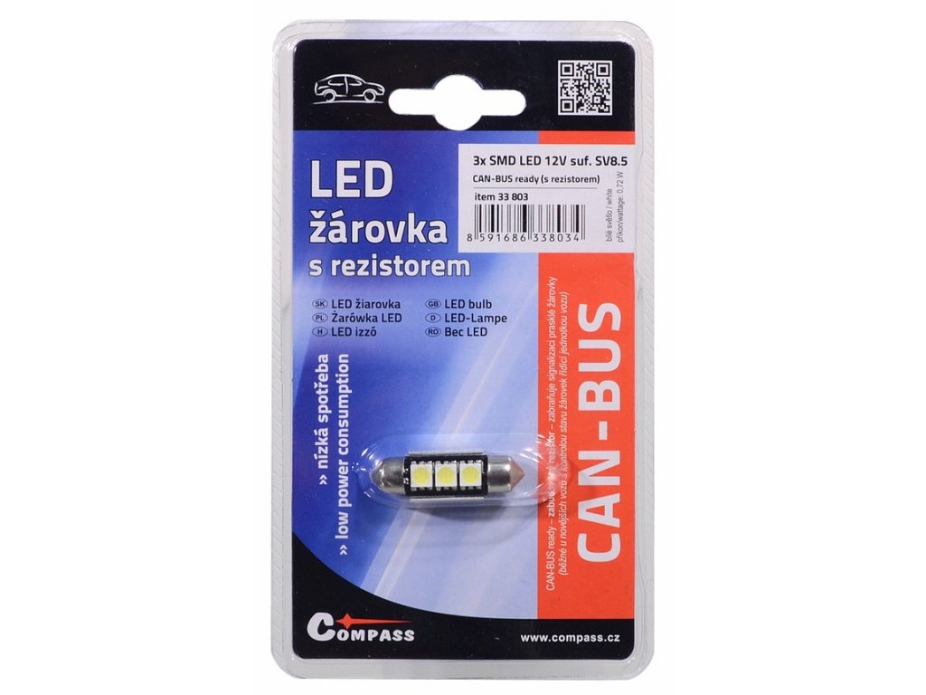 Žárovka 3 SMD LED 12V suf. SV8.5 36mm s rezistorem CAN-BUS ready bílá