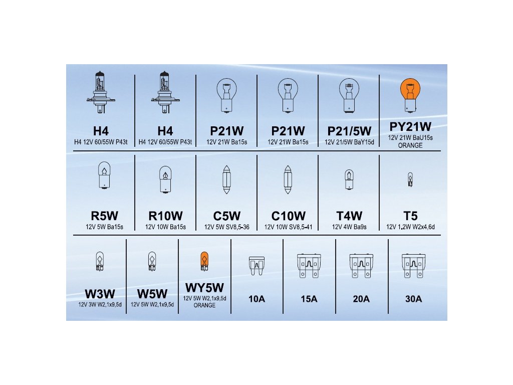 Uzavíratelný kufřík se sadou náhradních žárovek 12V a pojistek, homologace E.