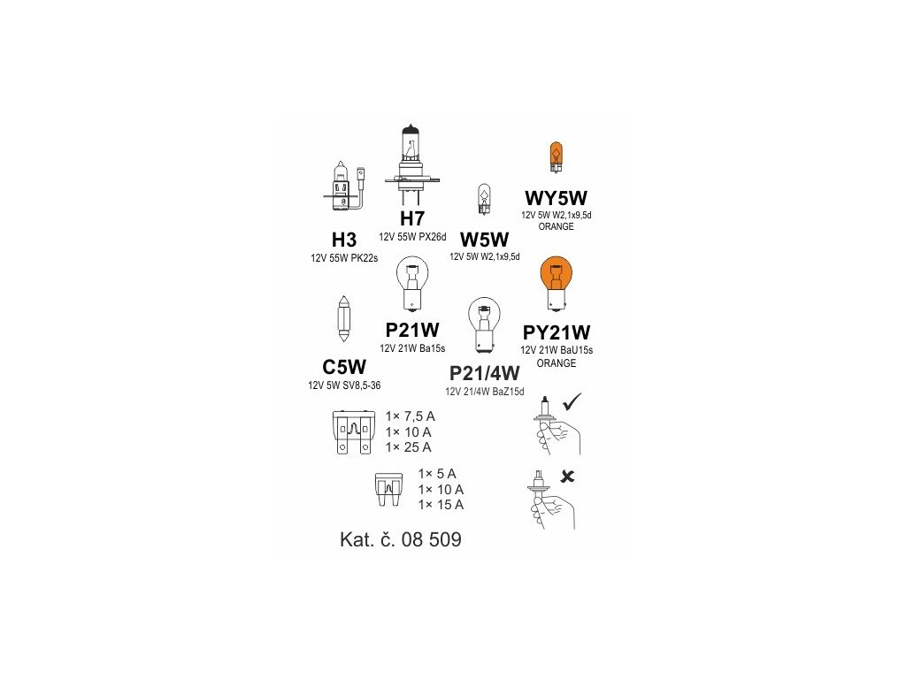 Plastová krabička náhradních autožárovek a pojistek, homologace E.