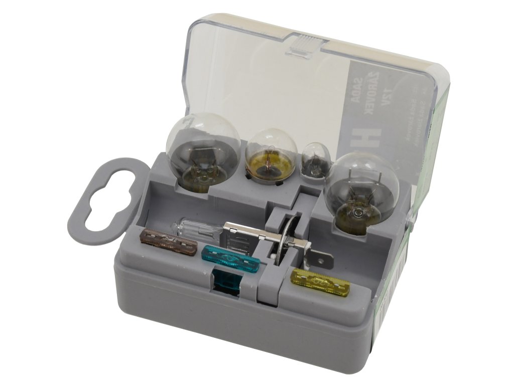 Univerzální servisní sada žárovek a pojistek v plastové krabičce.