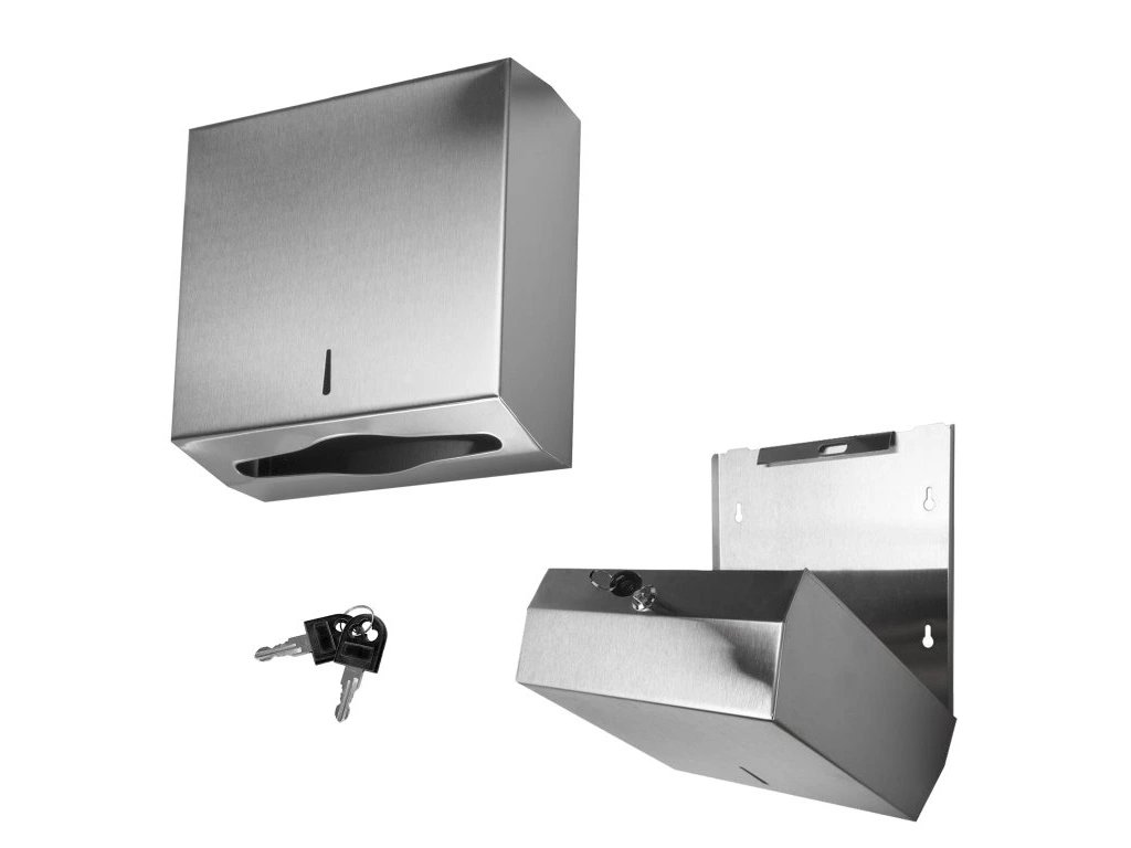 Nástěnný nerezový držák na skládané papírové ručníky. Vyklápění celé přední části zásobníku zajišťuje pohodlné doplňování.Zásobník na papírové ručníky, papírové utěrky nebo papírové kapesníky je uzamykatelný.
