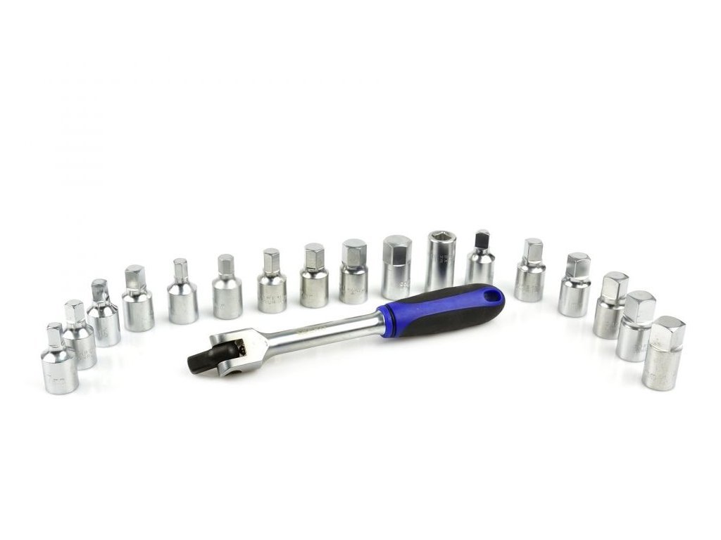 Sada specializovaných hlavic pro vyšroubování vypouštěcích zátek v olejových vanách. Sada obsahuje 17 ks zástrčných hlavic 3/8” a 3/8” kloubový klíč. Všechny prvky sady jsou vyrobeny z odolné nástrojové CrV oceli.