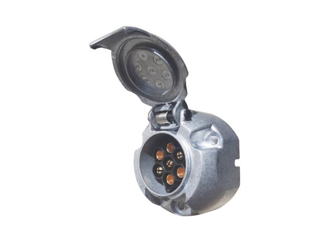 Kvalitní značková 7-mi pinová zásuvka v hliníkovém provedení bez odpojení mlhového světla. Těsná proti stříkající vodě. Spojovací materiál a podložka nejsou součástí balení.Materiál: nárazuvzdorný kov ve stříbrné barvě, CuZn kontakty.