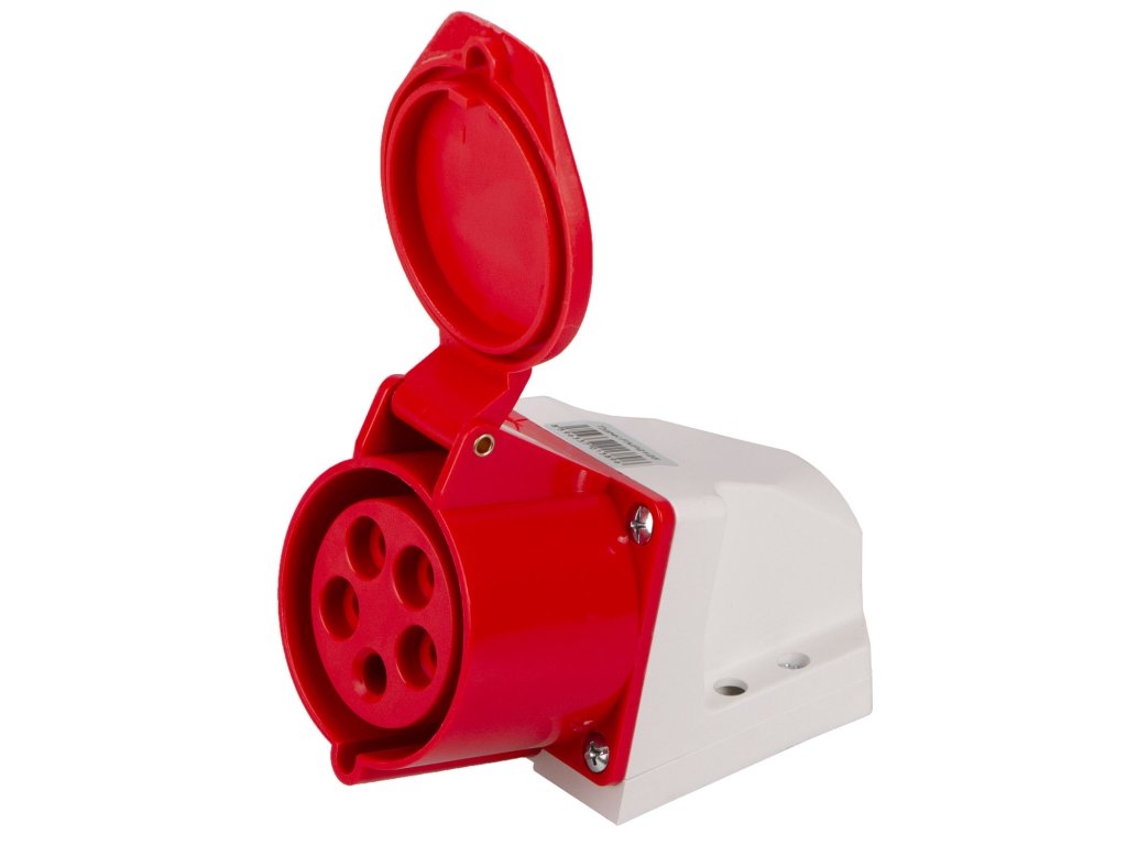 Průmyslová zásuvka na třífázový proud 380 V vhodná pro umístění na zeď.
