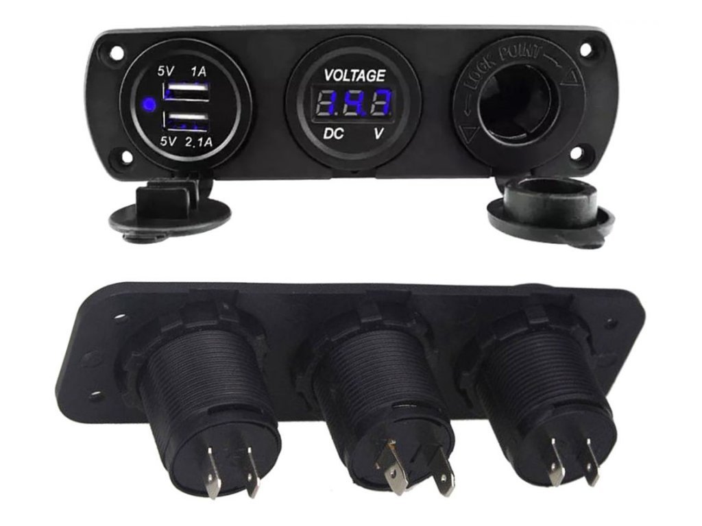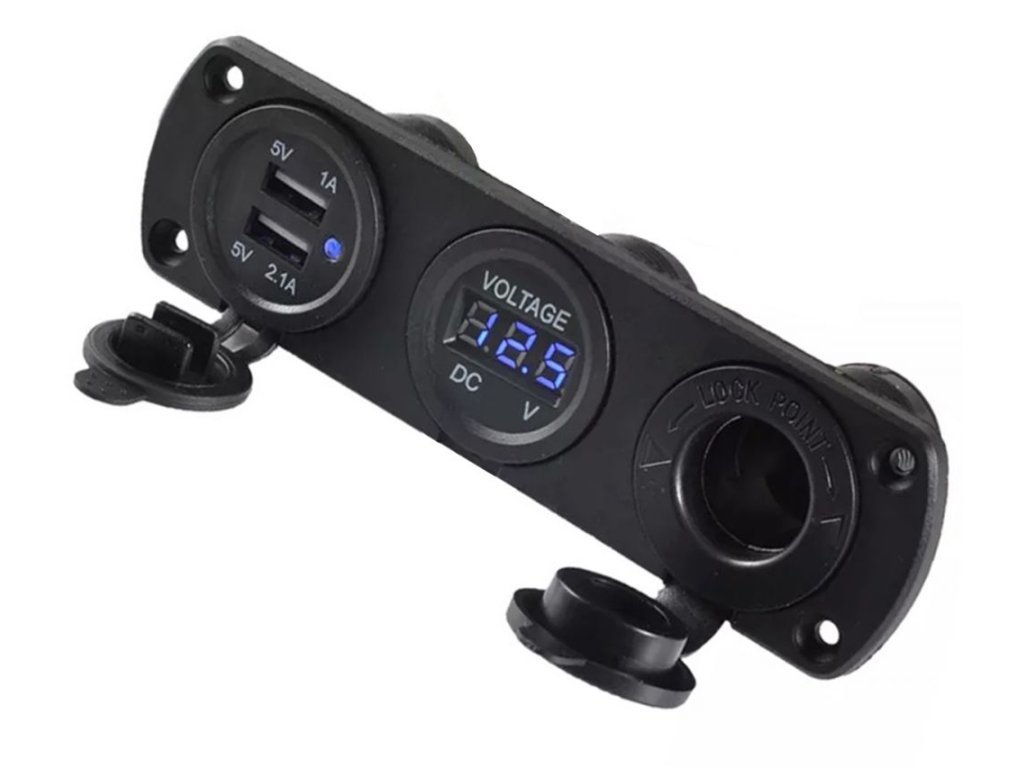 Vodotěsná zásuvka zapalovače se dvěma USB 5 V porty a vestavěným voltmetrem. Perfektní pro použití v autech, motocyklech, mopedech, čtyřkolkách a skútrech, ve všech vozidlech, která mají 12 V zapalovač. Umožňuje použití dalších dvou USB portů s proudem 2,1 A a 1 A při zachování plné funkčnosti autozapalovače a vestavěného voltmetru s displejem, umožňujícím měření aktuálního napětí.