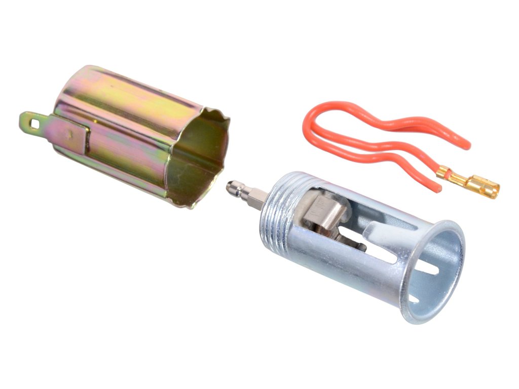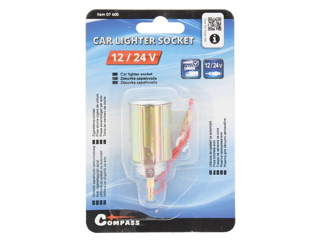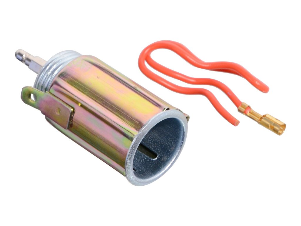Kovová zásuvka automobilového zapalovače určená pro montáž do automobilů s napětím 12V nebo 24V.