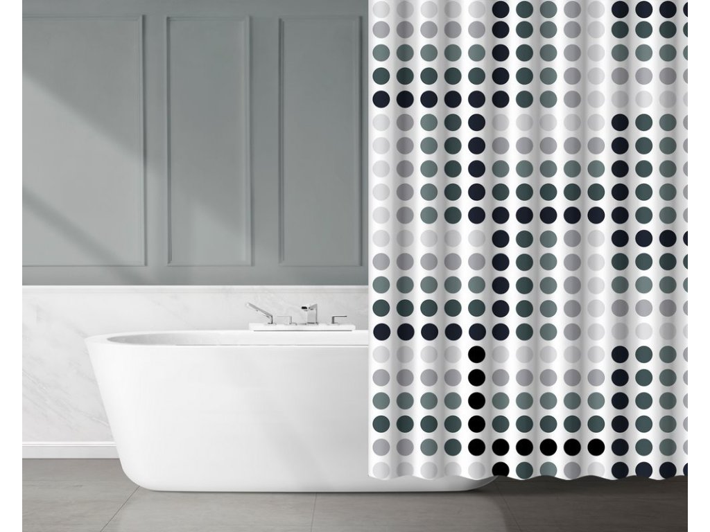 Textilní sprchový závěs v bílé barvě se vzorem šedých kruhů vyrobený z polyesteru.Sada obsahuje 12 bílých závěsných kroužků.