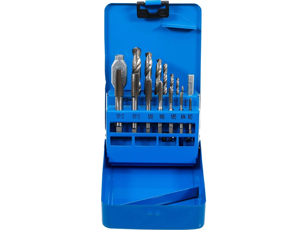 Sada závitníků M3 - M12 s příslušnými vrtáky HSS o průměrech 2,5 - 10,2 mm.