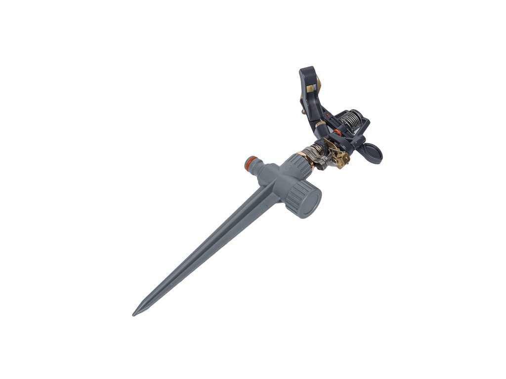 Pulzní kovový zavlažovač na plastovém trnu. Hrot má vsuvku pro rychlospojky a možnost sériového spojení s jinými zavlažovači. Maximální plocha zavlažovaní je 17 m.