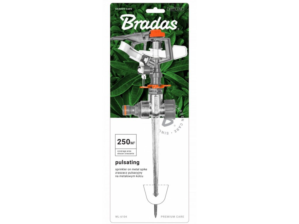 Pulzní zavlažovač na průchozím kovovém trnu z vysoce kvalitního plastu. Nastavitelná velikost a tvar zavlažované plochy. Uzamčení pro postřik vybraného sektoru. Trn má vsuvku pro rychlospojky a možnost sériového spojení s dalšími zavlažovači. Maximální průměr zavlažovací plochy 18 m (cca 250 m²).