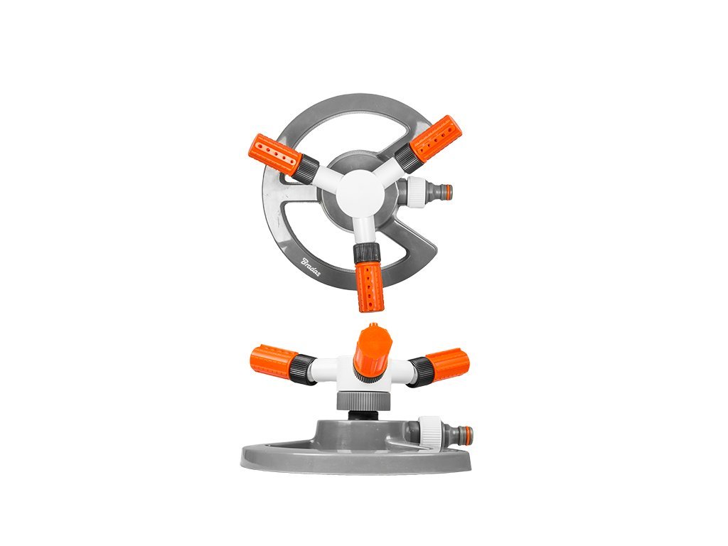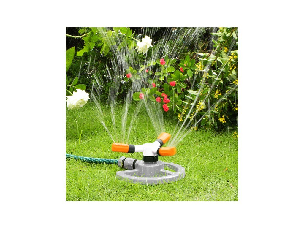 Zavlažovač rotační trojramenný s nastavitelnými výkyvnými rameny pro nastavení rozsahu zavlažování. Rotace zajišťuje rovnoměrné zavlažování.