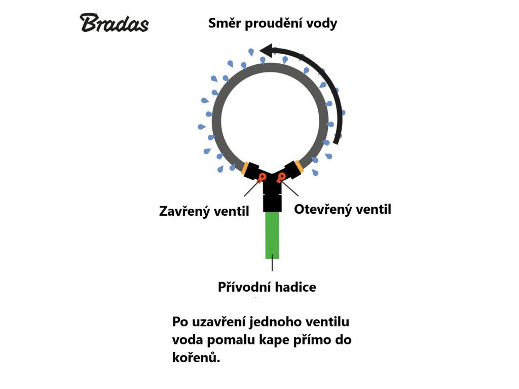Ventily slouží nejen k regulaci průtoku vody, ale hlavně k zastavení vody při přemístění - například když je kruhová hadice umístěna kolem kmene stromu, přívod vody se zastaví pomocí ventilů a není třeba jít až k vodovodnímu řádu. Díky kruhovému tvaru dokáže hadice rovnoměrně pokrýt celou zavlažovanou plochu a zajistit tak optimální distribuci vody.