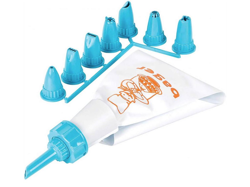 Plastová sáčková zdobička s 8 nástavci na zdobění dortů, perničků apod.Barva dle skladové dostupnosti.