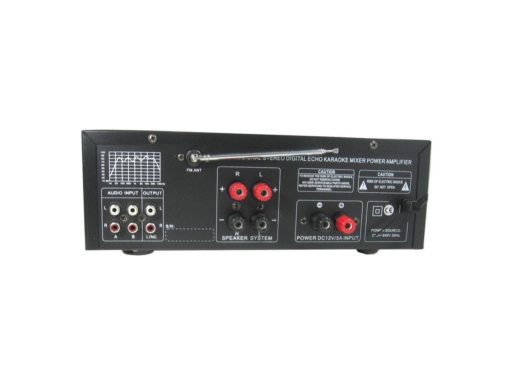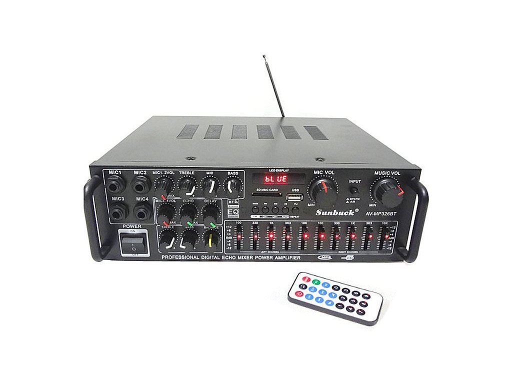Zesilovač, rádio, bluetooth, přehrávač MP3 Sunbuck AV-MP326BT Univerzální přístroj s možností napájení 230VAC nebo 12-14VDC sdružující více funkcí. Nf zesilovač s ekvalizérem, bluetooth, přehrávač MP3 (slot USB nebo SD), rádio FM, vše s dálkovým ovládáním.**Specifikace:**