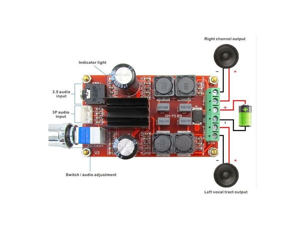 Zesilovač 2x50W D class, modul HX-M189 Dvoukanálový stereo zesilovač 2x50W ve třídě D s integrovanou ochranou proti přehřátí a zkratu.**Specifikace:**