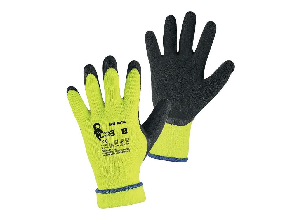 Zimní bezešvé pletené rukavice, akrylový úplet česaný z rubové strany, dlaň a prsty povrstveny latexovou pěnou, zdrsněný protiskluzový povrch, ochrana proti kontaktnímu teplu do 250 °C.
