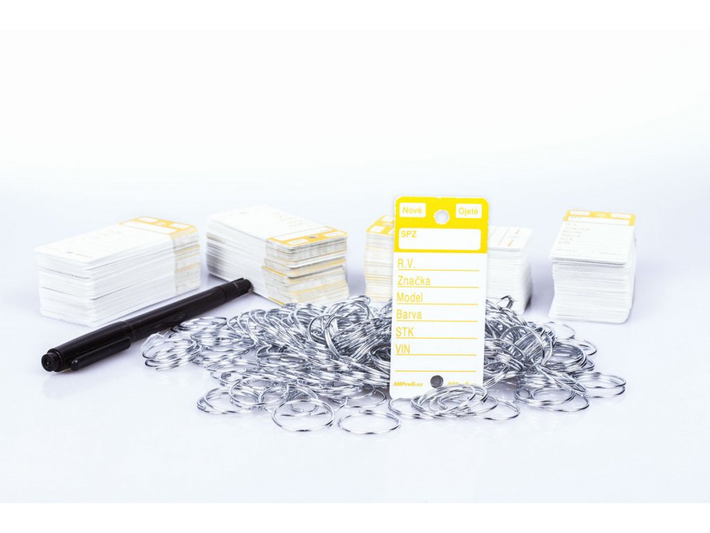 Bílé plastové visačky na klíče se žlutým potiskem jsou velkou pomůckou převážně pro autobazary, případně autosalony pro snadnou identifikaci klíčů. Jednoduše pak poznáte, kterému autu klíček patří díky vyplněným polím na jmenovce. Permanentním fixem, který je přiložen jako dárek, napíšete na cedulku na klíče SPZ, rok výroby, značku, model a barvu vozu. Datum STK a VIN, zaškrtnete zda se jedná o nové či ojeté vozidlo. Použitím permanentního fixu nemusíte řešit smývání, ušpiněné prsty apod. Na klíče připevníte rozlišovač za pomoci přiloženého kroužku, což může být o trochu složitější než instalace u modelů Easy-ON, nebo Econo ID.