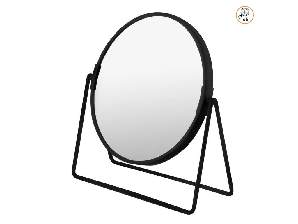 Kosmetické zrcátko ve stylovém černém rámu bude skvělým doplňkem industriálních nebo moderních interiérů.Funkčnost dodává otočný rámeček – po otočení skla na druhou stranu získáme pětinásobné zvětšení obrazu.